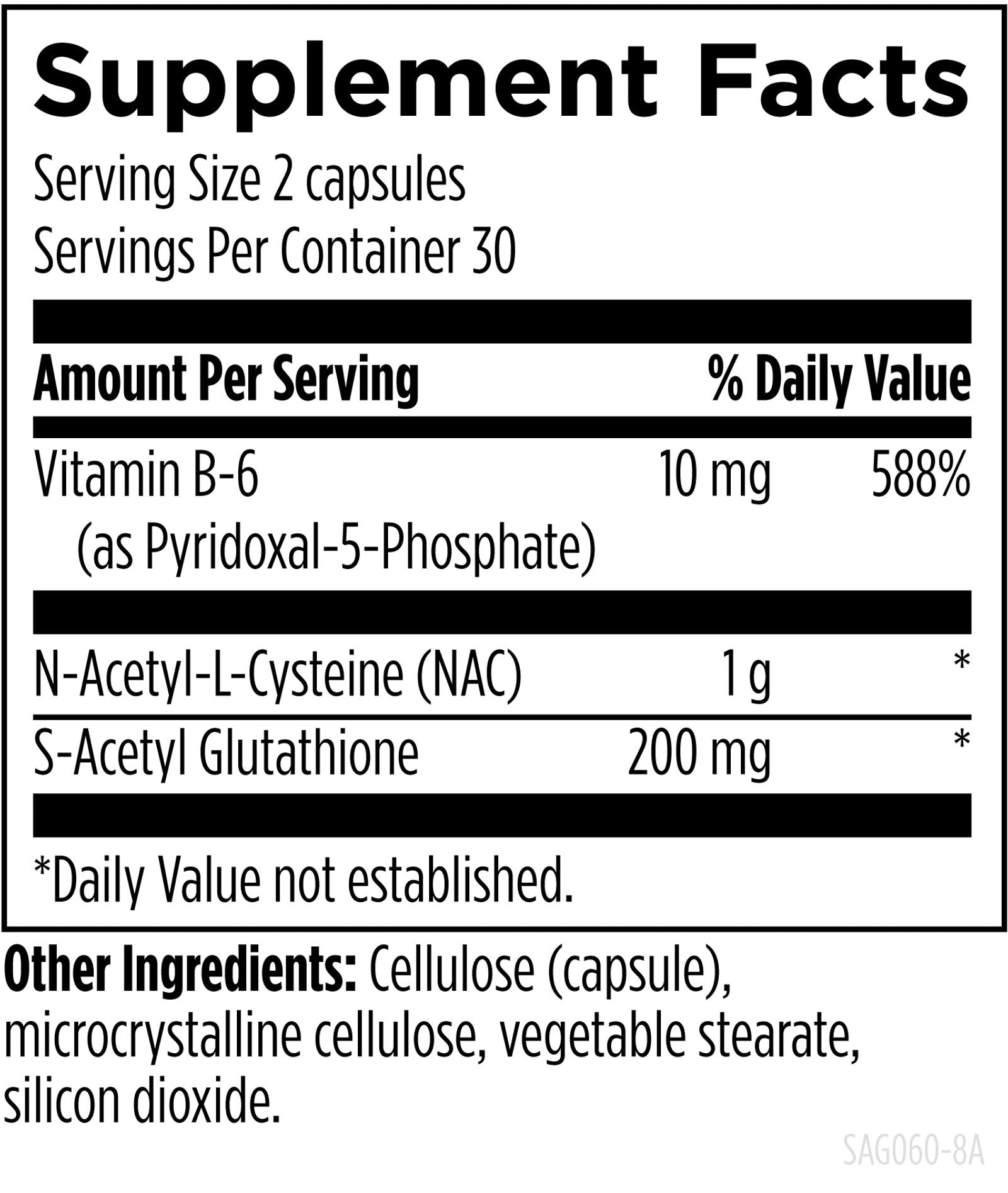 Provides 200 mg of S‑acetyl glutathione, 10 mg of vitamin B6 (as P5P), and 1 g of N‑acetyl‑L‑cysteine to support antioxidative status and optimal cellular health*